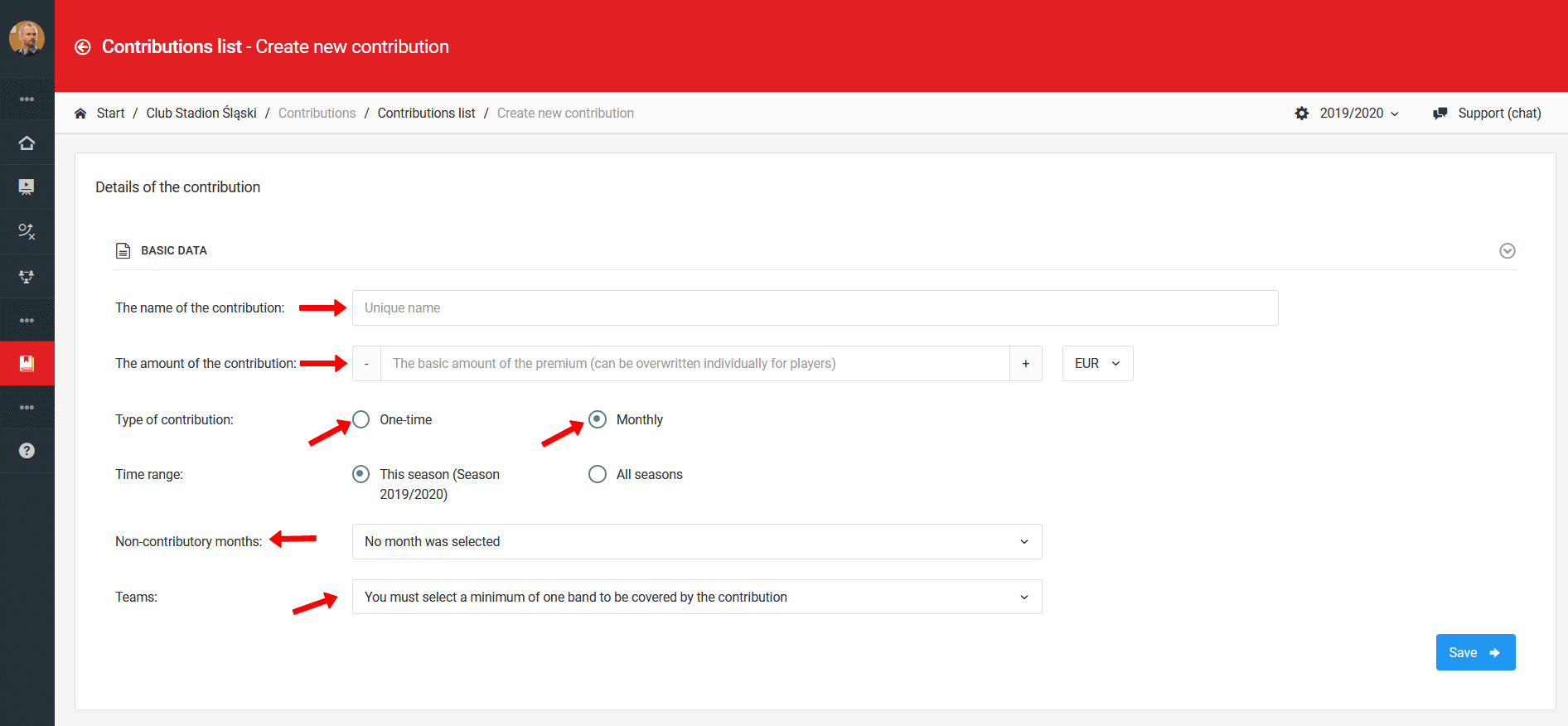 Κατά τη δημιουργία της συνεισφοράς σας, δώστε ιδιαίτερη προσοχή σε διάφορες πτυχές. Εάν ο σύλλογος σας έχει περισσότερες από μία συνεισφορές, π.χ. στις νεότερες ηλικίες η συνεισφορά είναι 20 ευρώ και στις μεγαλύτερες ηλικίες είναι 40 ευρώ, συνιστάται να δημιουργήσετε δύο συνεισφορές. Στη φόρμα δημιουργίας συνεισφοράς έχετε πολλά σημαντικά πεδία για συμπλήρωση. Το πρώτο είναι το όνομα της συνεισφοράς, το επόμενο είναι το ποσό, ο τύπος και η περίοδος ισχύος. Στο κάτω μέρος της φόρμας θα δείτε δύο πλαίσια ελέγχου. Στον πρώτο, επιλέγετε μήνες χωρίς συνεισφορά, όπως μήνες διακοπών. Εάν συλλέξετε τη συνεισφορά σας καθ 'όλη τη διάρκεια του έτους, παραλείψτε αυτό το πλαίσιο. Το τελευταίο πλαίσιο είναι ορατό μόνο σε λογαριασμούς διαχειριστή. Εκεί, επιλέγετε τις ομάδες που θα καλύπτονται από αυτήν τη συνεισφορά.